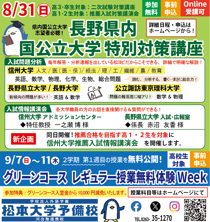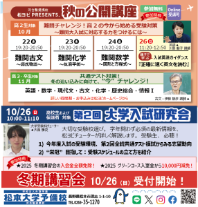 10/12(日) 市民タイムスに秋の公開講座、大学入試研究会、冬期講習会の案内が掲載されました。