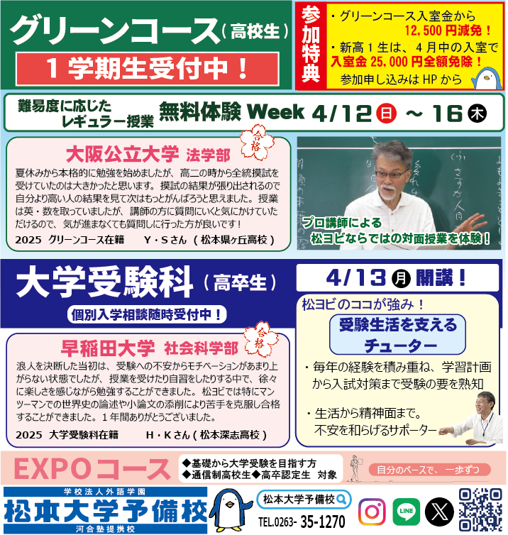 4/4(土)市民タイムスに、大学受験科入学案内、高校グリーンコース、EXPOコースの案内が掲載されました。